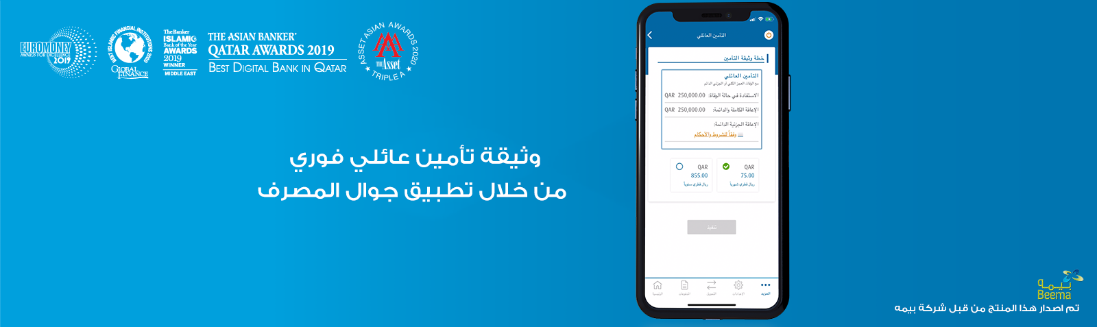 وقد قامت شركة الضمان للتأمين الإسلامي (بيمه) بتصميم برنامج التكافل الأسري، لتأمين ضمانة مالية لعائلة المشترك في البرنامج، والتخفيف من المسؤوليات المالية المترتبة عليهم عند حصول أي حدث غير متوقع كالوفاة أو الإعاقة الدائمة لا قدّر الله. ويمكن لعملاء المصرف الآن شراء وثيقة التأمين العائلي مقابل 75 ريال قطري شهرياً فقط، والحصول على تغطية تكافلية بقيمة 250,000 ريال قطري، التي ستساهم في تقديم الدعم في وقت الشدّة.