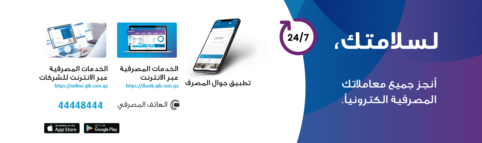 نظراً للظروف الراهنة والتطورات المستجدة المتعلقة بفيروس كورونا ، يدعو مصرف قطر الإسلامي (المصرف) جميع عملائه إلى اجراء كافة التعاملات المصرفية بأمان ويسر عبر تطبيق جوال المصرف ، بالإضافة إلى منصة الخدمات المصرفية للأفراد والشركات عبر الانترنت، لتلبية جميع متطلباتهم المصرفية والحدّ من حاجتهم إلى زيارة أي من فروع المصرف.