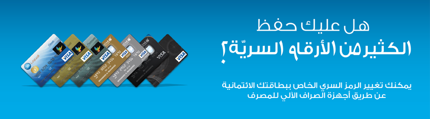 ضمن سعينا الدائم لتطوير وتحسين خدماتنا، أطلق المصرف خدمة تغيير الرمز السري للبطاقات الائتمانية من خلال أجهزة المصرف للصرف الآلي. تأتي هذه الخدمة نظراً لكثرة استخدام العملاء للكلمات والرموز السرية بحيث بات يصعب على العملاء حفظ جميع أرقامهم السرية، ولذلك تم تطوير خدمة تغيير الرمز السري من خلال أجهزة المصرف للصرف الآلي.