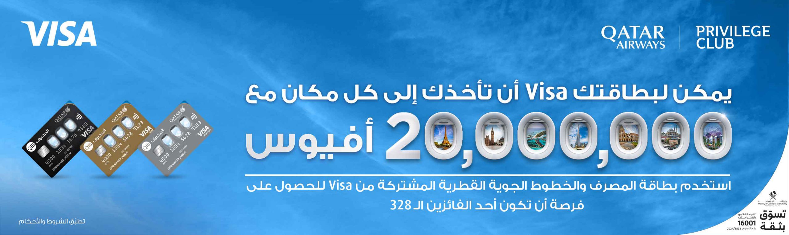 وفي الفترة من 20 مايو إلى 19 يونيو، سيتأهل حاملو البطاقات المشتركة للفوز باستخدام بطاقات المصرف والخطوط الجوية القطرية المشتركة من Visa، عند إجراء عمليات الشراء سواء محلياً أو دولياً بما في ذلك المعاملات عبر الإنترنت. يساهم كل استخدام في زيادة فرص الفوز، ويحظى العملاء بفرصة الفوز عندما يصل الحد الأدنى للاستخدام خلال فترة العرض إلى 10,000 ريال قطري على بطاقة Visa الذهبية المشتركة و15,000 ريال قطري باستخدام البطاقة البلاتينية المشتركة، و25,000 ريال قطري باستخدام بطاقة Visa سيغنتشر.