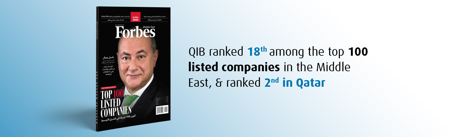 Qatar Islamic Bank (QIB) was ranked #18 out of Top 100 Companies in the Middle East by Forbes Middle East Magazine’s annual ranking of the top 100 listed companies in the region for 2021. The Bank was ranked 2nd top company in Qatar according to the same ranking.
