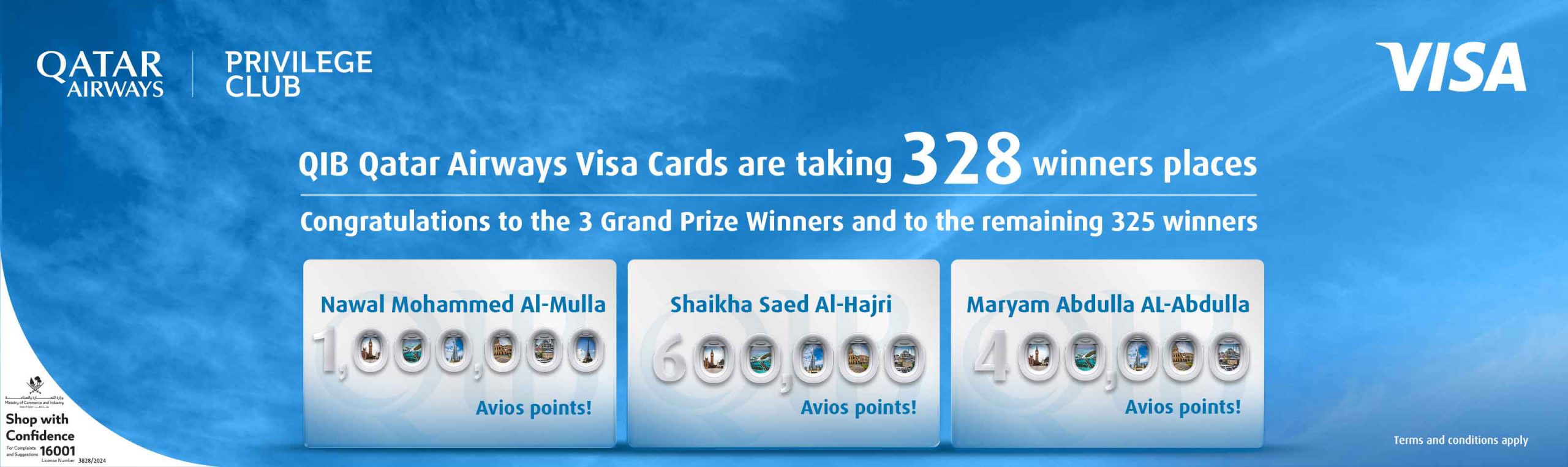 The winners were selected at the official draw under the supervision of the Ministry of Commerce and Industry (MOCI) officials and QIB. A total of 328 lucky cardholders received Avios points, including, Nawal Mohammed Al-Mulla, Shaikha Saed Al-Hajri and Maryam Abdulla Al-Abdulla, who received the grand prize of 1,000,000 Avios, 600,000 Avios and 400,000 Avios respectively, enhancing their travel experiences with Qatar Airways.