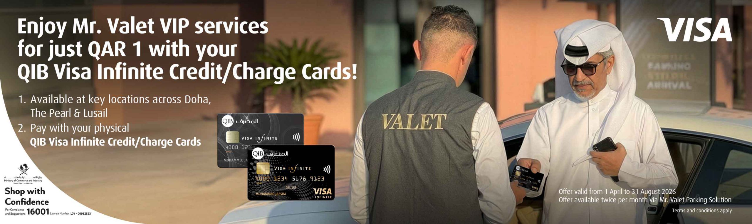 Enjoy a seamless experience with Mr. Valet, offering you exclusive access to VIP valet parking services for QAR 1 twice a month at prime destinations across Qatar with your QIB Visa Infinite Credit or Charge Card. Whether shopping, dining, or meeting friends, your comfort and convenience come first.